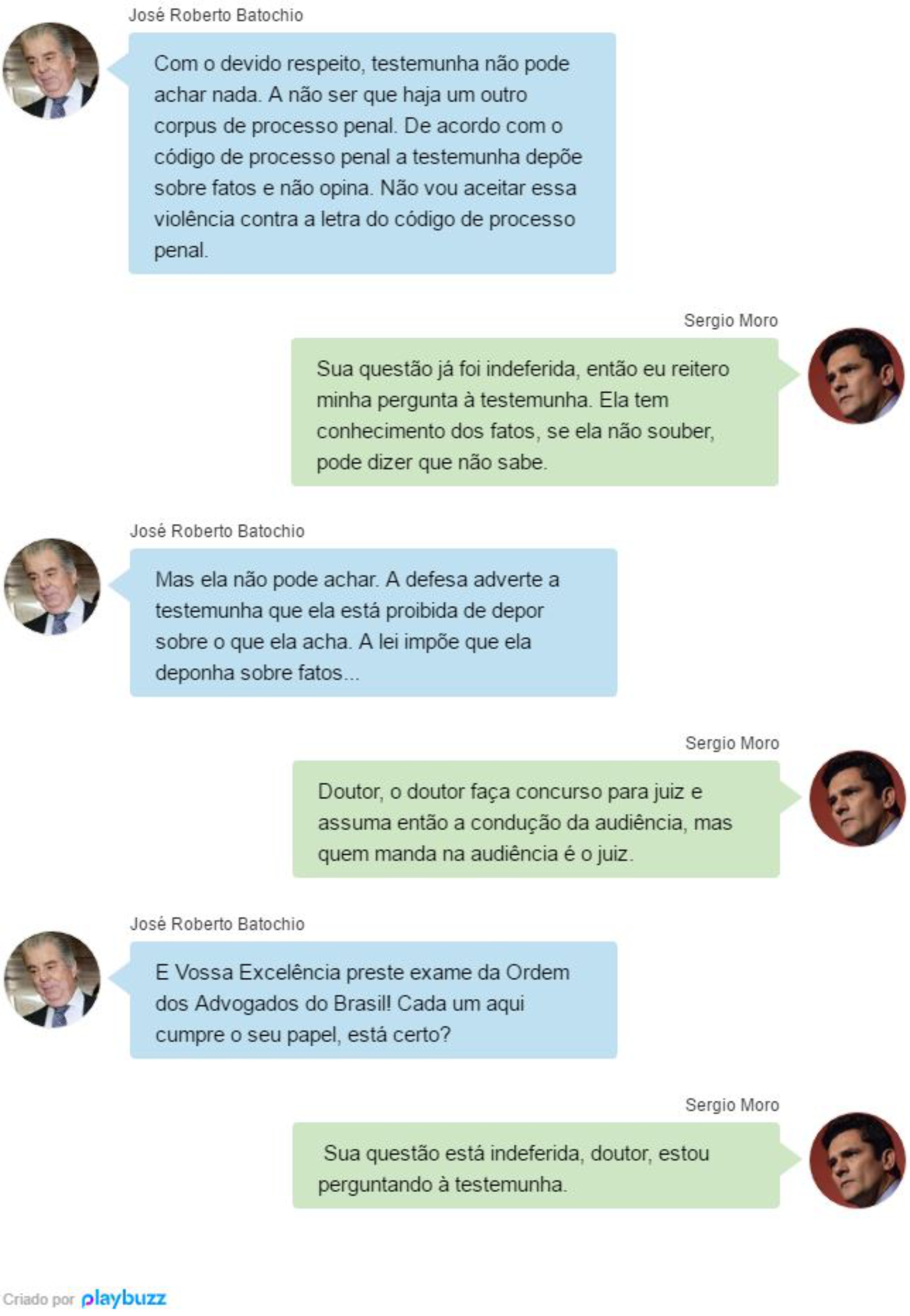 Depois de ouvir de Sampaio a confirmação de que seu cliente é o “Italiano” das planilhas da Odebrecht, Batochio interrompeu uma resposta da testemunha a Moro, alegando que o executivo falava a respeito do que achava, e não dos fatos.