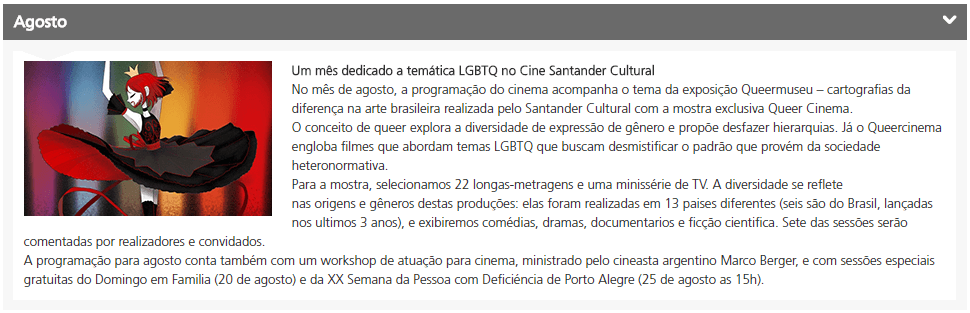 No entanto, antes de analisar os argumentos do curador da exposição, é preciso lembrar que agosto é o mês da temática LGBTQ no Santander Cultural, como mostra a imagem a seguir. E por falar em LGBTQ, daqui a pouco vai faltar alfabeto para atender às demandas da sigla.