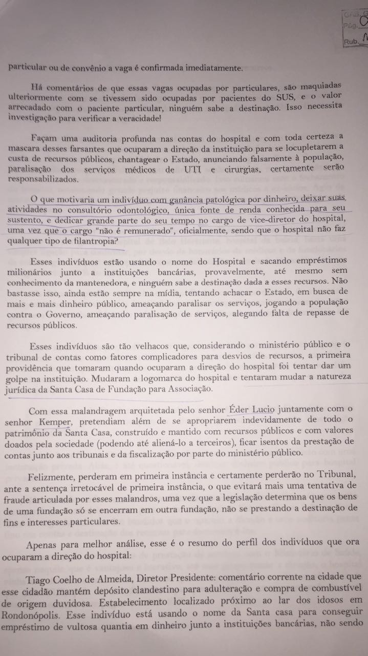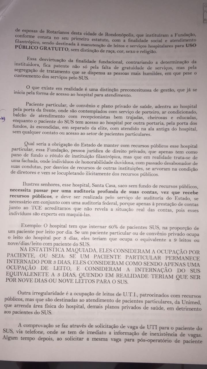 “Ilustres senhores, esse Hospital, a Santa Casa, é um saco sem fundo de recursos públicos, necessita passar por uma auditoria profunda de suas contas, vez que recebe recursos públicos, e que deve ser realizada pelo serviço de auditoria do Estado, se necessário em conjunto/parceria com uma auditoria federal, porque apenas a prestação de contas junto ao Tribunal de Contas do Estado de Mato Grosso (TCE), acreditamos que não revela a situação real das contas, pois esses indivíduos são ‘experts’ em maquiá-las” consta na denúncia.