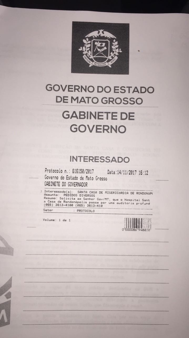 “Na verdade, senhores, não existe falta de recursos na Santa Casa. O que estão fazendo é um verdadeiro teatro para tentar extorquir o Estado, o que falta na Santa Casa é vergonha na cara dos bandidos que ocuparam a direção e uma auditoria pente fino nas contas e destinação dos recursos para desmascará-los. A instituição faz contrato de prestação de serviço com o Ministério de Saúde, apenas naquilo que e vantajoso e lucrativo, até esse grupo tomar a direção, o Hospital vinha atendendo normalmente uma vez que recebe muito bem pelos serviços, ainda que pelo SUS, pois os atendimentos que presta são de curta permanência e só contratam os mais bem pagos na tabela SUS”, finaliza o documento entregue no gabinete do governador Pedro Taques.