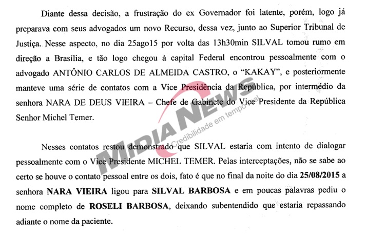 No relatório, o Gaeco também destacou as movimentações feitas por Silval para tentar obter a soltura da esposa, inclusive tentando marcar um encontro com o então vice-presidente da República, Michel Temer (PMDB).