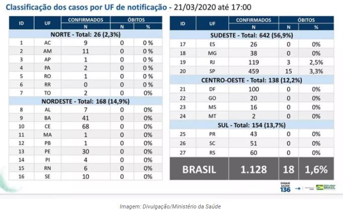 Brasil tem 1.128 casos confirmados de Covid-19. Balanço federal aponta 18 mortes.
